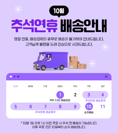 10월 1일 오후 1시 이전 주문 시 추석 전 배송이 가능합니다.